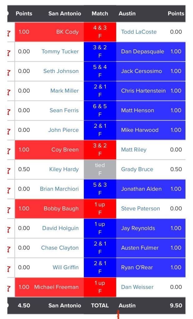 A blue wave hit Tapatio Springs on Sunday, with Team Austin winning their Singles matches 9.5 – 4.5, clinching the 2022 Rudy’s I-35 Cup by a score of 17-11. A strong early wave, and another strong late wave was plenty to have the Cup in hand with 5 matches remaining on the course. Grady Bruce was 1-down in his match most of the day, but rallied late to tie things up at the 16th, and hold on for a halved-match, good enough for the Cup-clinching half point. This avenged Grady’s last trip to San Antonio as team captain in 2017 – congratulations Grady!